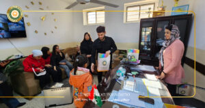 بعد ذلك، بدأ الطلاب بتوزيع مجموعة من المستلزمات على الأطفال، مثل الملابس، والأدوات المنزلية، وحوامل تجفيف الملابس، ولوازم الإضاءة.