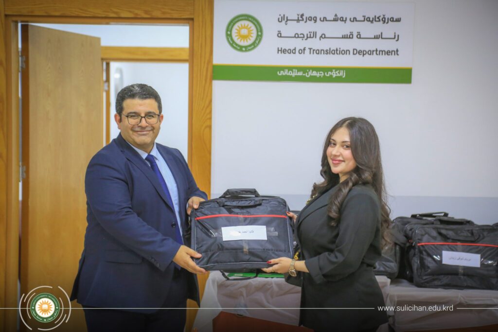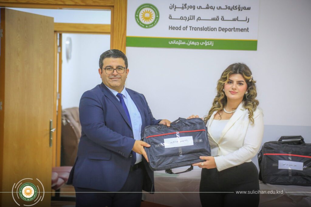 خلال الاحتفالية، قامت رئاسة قسم الترجمة، بالتعاون مع تدريسيي جامعة جيهان-السليمانية، بمنح 16 جهاز حاسوب محمول (لابتوب) لطلاب المرحلة الثانية في القسم، ليتمكنوا من الاستفادة منها كحاجة ضرورية لإعداد السيمنارات (الحلقات الدراسية) والواجبات الدراسية اليومية. وبدوره، قدم أ.د. أوميد رفيق فتاح، رئيس الجامعة، شكره وتقديره للأساتذة الأفاضل الذين ساهموا ودعموا هذا المشروع، متمنياً لهم التوفيق والنجاح.
