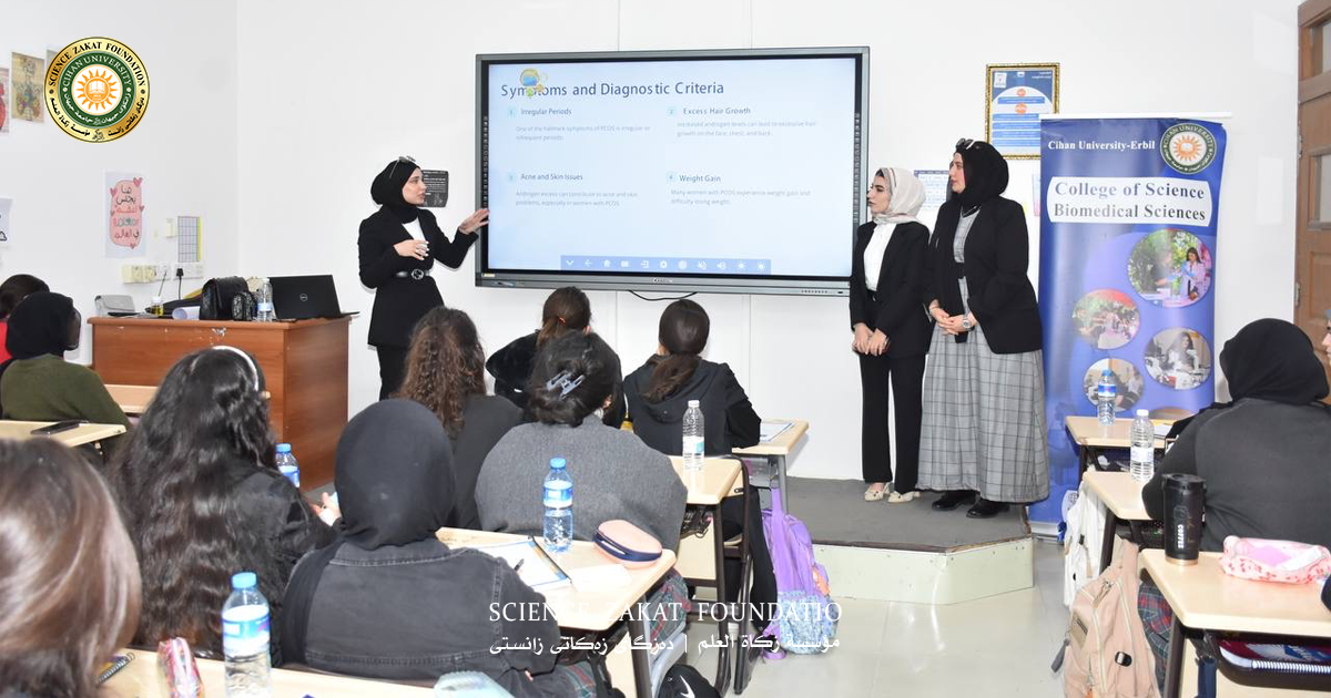 حظي الطلبة باستقبال حافل من قبل السيد (ازاد حمد عبد الله)، مدير المدرسة، حيث أقيمت الندوة في قاعة المدرسة بحضور طلبة الصفين الحادي عشر والثاني عشر. قدم طلبة العلوم الطبية الحيوية شرحا شاملا حول متلازمة تكيس المبايض، شمل العوامل المسببة لها، والأعراض السريرية، وطرق الوقاية، والأساليب العلاجية المتاحة. وتعد هذه المتلازمة اضطرابا هرمونيا شائعا بين النساء في سن الإنجاب، وتتميز بعدم انتظام الدورة الشهرية، وارتفاع مستويات الأندروجين، وظهور تكيسات متعددة على المبايض، مما قد يؤدي إلى العقم ومضاعفات أيضية إذا لم تعالج.